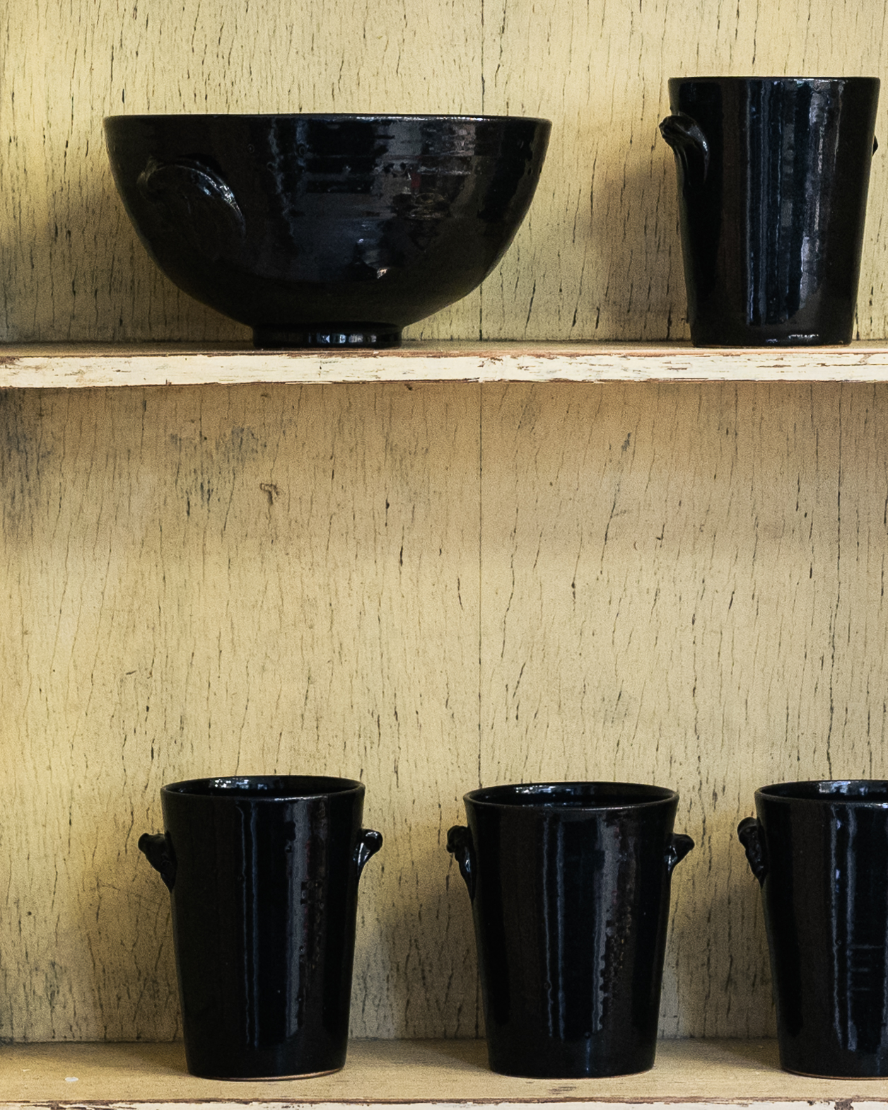 Diamond patterned stoneware beakers in three colours. Made to order.